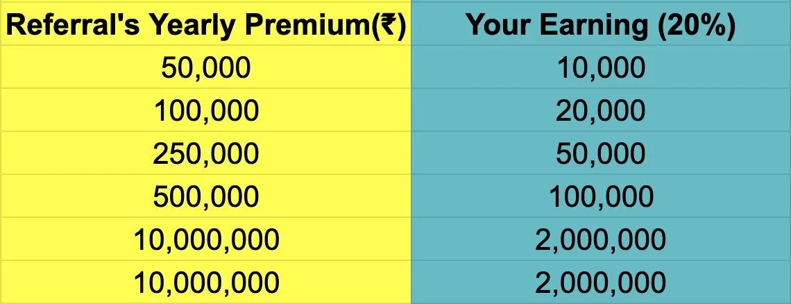 If you refer someone buying a ₹5 lakh yearly premium policy, you earn ₹1,00,000.